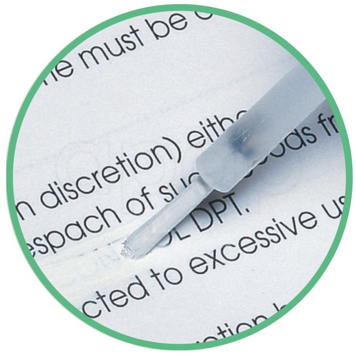 Korekční strojek s vyměnitelnou opravnou páskou. Nanesený korekční film je suchý, s okamžitou možností přepsání. Technologie flexibilní špičky.